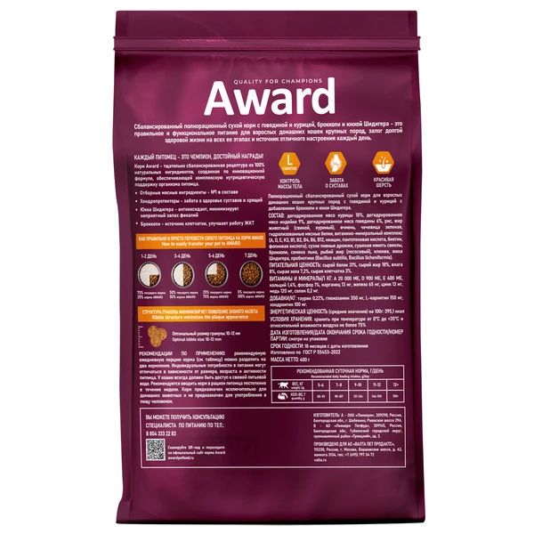Сухой корм AWARD Indoor Big cats для взрослых домашних кошек крупных пород с говядиной и курицей с добавлением брокколи и юкки Шидигера 400 г Корм изготовлен из 100% натуральных ингредиентов по инновационной формуле — это обеспечивает комплексную нутрицевтическую поддержку организма питомца. Корм обогащен полиненасыщенными жирными кислотами, которые повышают качество шерсти и укрепляют иммунитет. Пробиотики и пребиотики помогают сохранять естественный баланс кишечной микрофлоры и способствуют оптимальному усвоению питательных веществ. Добавление L-карнитина позволяет контролировать массу тела, что особенно важно для кошек крупных пород. Без красителей и консервантов.