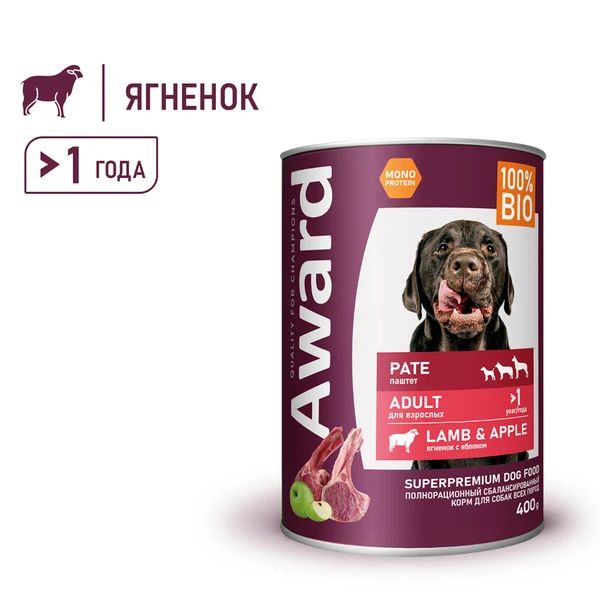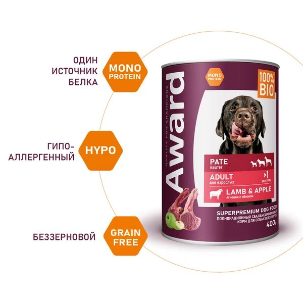 Паштет из ягненка с кусочками яблока для взрослых собак - это монопротеиновое сбалансированное питание для любимого питомца, изготовленое из одного вида мясного белка без содержания зерна и глютена, с добавлением овощей и фруктов богатых витаминами и минералами.