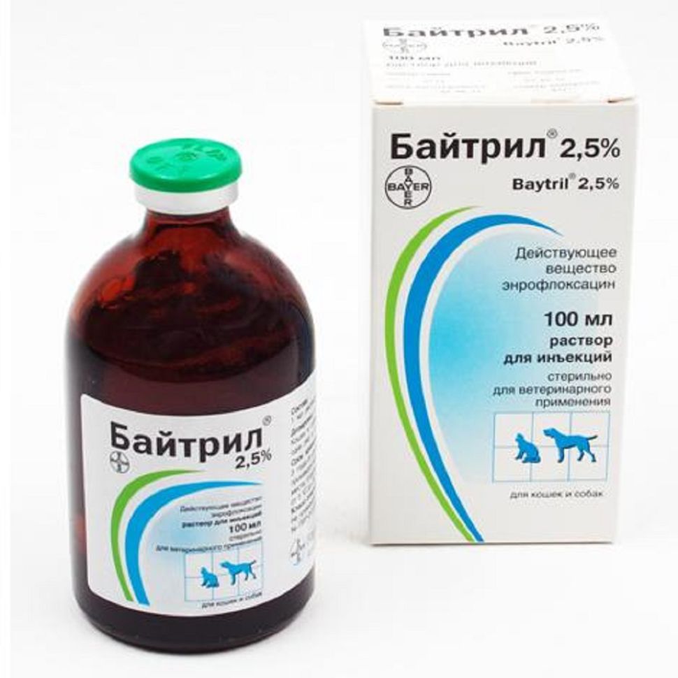 Байтрил 2,5% инъекционный раствор вводят собакам и кошкам подкожно или внутримышечно в дозе 0,2 мл на 1 кг массы животного (5 мг энрофлоксацина на 1 кг массы) один раз в сутки в течение 3 – 10 дней. В связи с возможной болевой реакцией препарат не следует вводить животному в одно место в объеме, превышающем 2,5 мл. Если в течение 3 – 5 дней не произойдет заметного клинического улучшения, рекомендуется провести повторную проверку на чувствительность выделенных от больного животного микроорганизмов к фторхинолонам или заменить Байтрил на другой антибактериальный препарат.