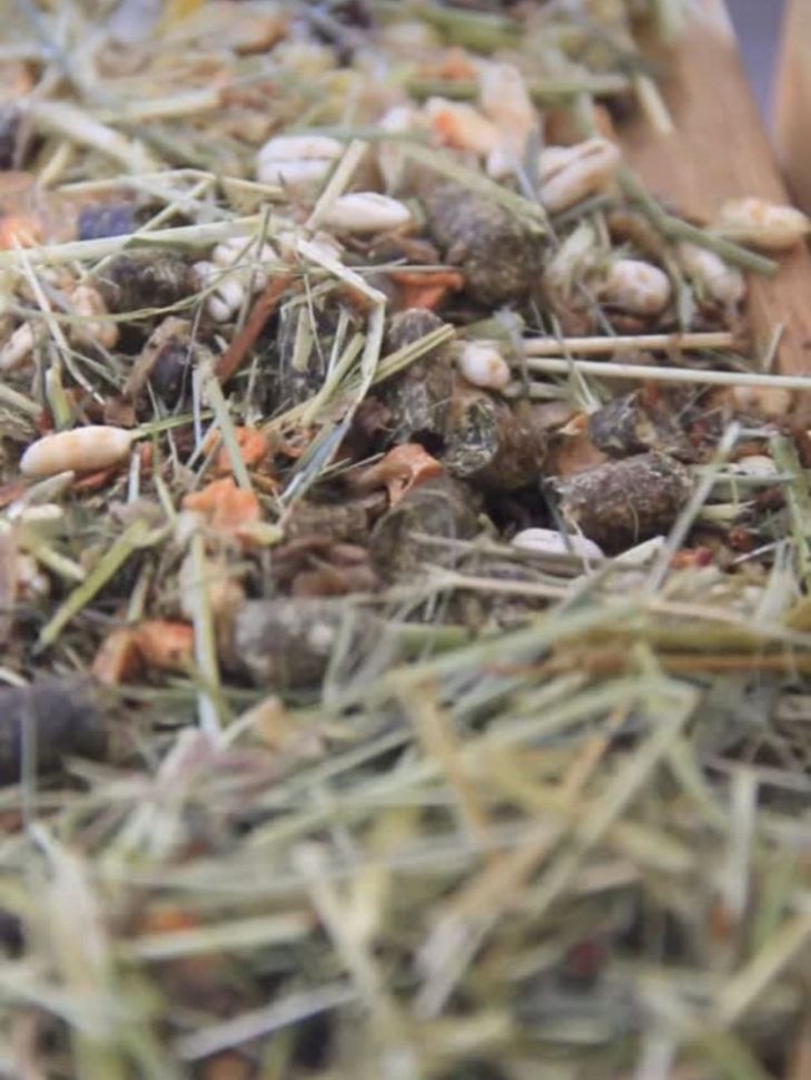 Состав: Сечка люцерны, соя экструдированная, гранула из пшеничных отрубей, хлопья амаранта, яблочные волокна, гранула люцерны, морковь сушеная, масло кукурузное холодного отжима, свекла сушеная, волокно конопли, семечка подсолнечная гранулированная, мята сушеная, шалфей, фенхель.