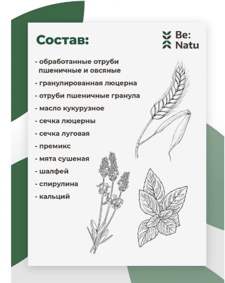 Состав: Обработанные отруби пшеничные и овсяные, гранулированная люцерна, отруби пшеничные гранула, масло кукурузное, сечка люцерны, сечка луговая, премикс, мята сушеная, шалфей, спирулина, кальций