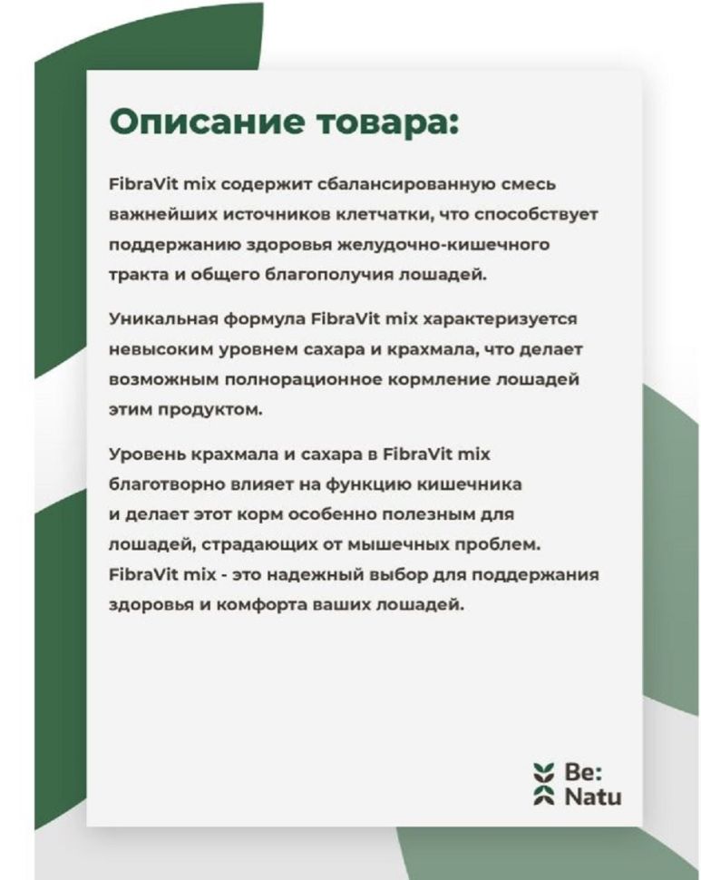 FibraVit mix содержит сбалансированную смесь важнейших источников клетчатки, что способствует поддержанию здоровья желудочно-кишечного тракта и общего благополучия лошадей. Уникальная формула FibraVit mix характеризуется невысоким уровнем сахара и крахмала, что делает возможным полнорационное кормление лошадей этим продуктом. Уровень крахмала и сахара в FibraVit mix благотворно влияет на функцию кишечника и делает этот корм особенно полезным для лошадей, страдающих от мышечных проблем. FibraVit mix - это надежный выбор для поддержания здоровья и комфорта ваших лошадей.