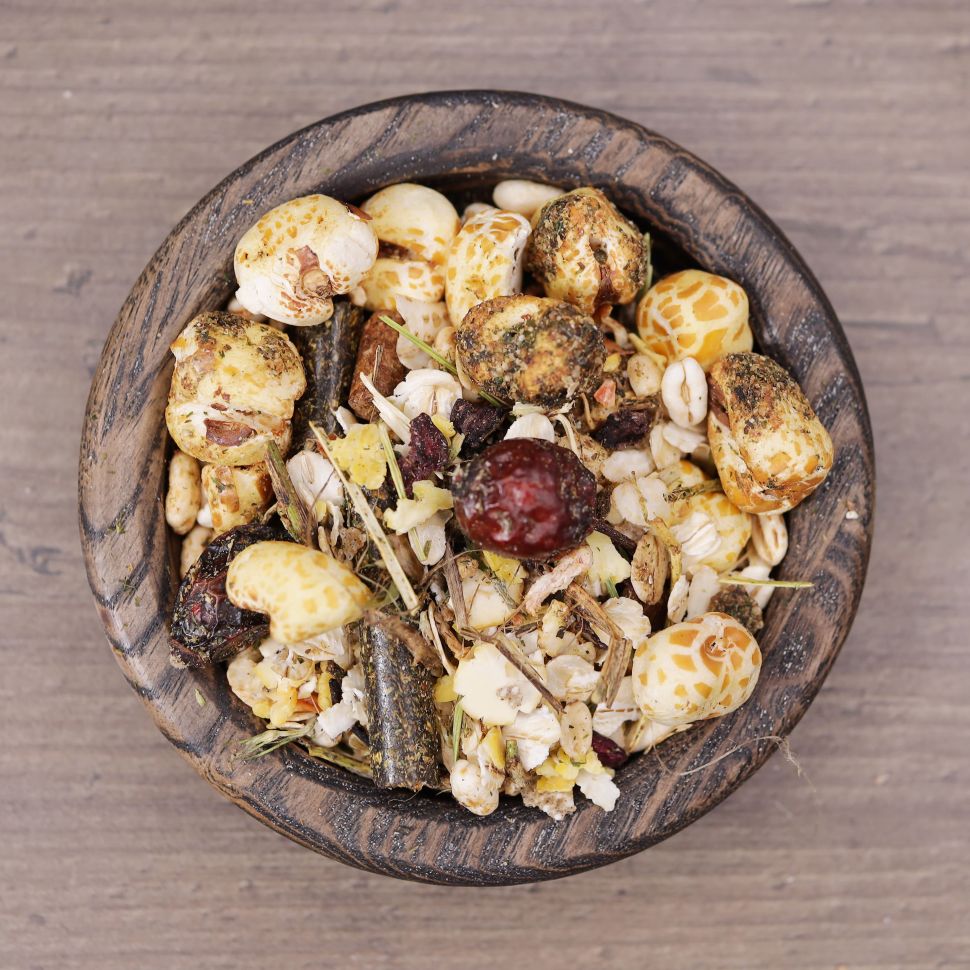 Состав: Хлопья ячменя, соя экструдированная, отруби пшеничные гранулированные, люцерна гранулированная, хлопья амаранта, хлопья кукурузы, хлопья гороха, сечка люцерны, масло кукурузное, семя тыквы, паффинг ячменя, паффинг кукурузы, сушеная морковь, сушеная свекла, шиповник, мята.