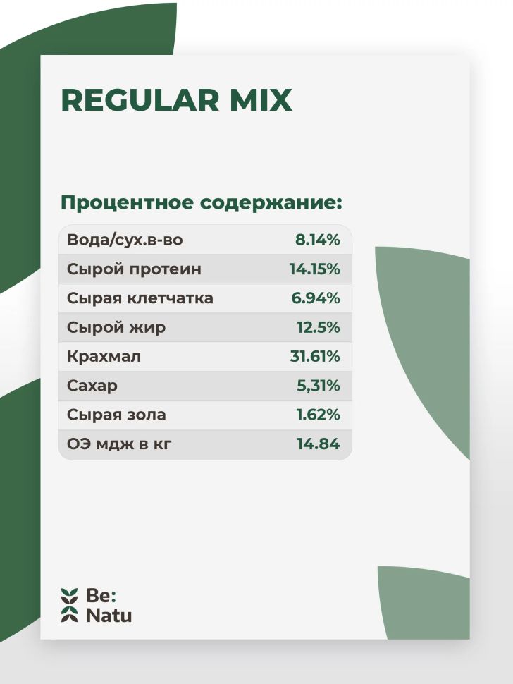 Regular Mix предоставляет вашей лошади необходимые питательные вещества для поддержания здоровья и мышечной массы, несмотря на период отдыха или сниженной активности. Этот микс обеспечивает балансированное питание, которое помогает сохранить оптимальное состояние вашей лошади и готовность к будущим физическим нагрузкам.