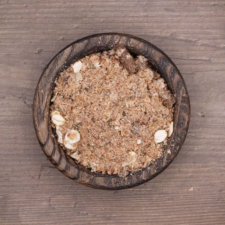 Состав | • отруби пшеничные пушные • льняной жмых • хлопья амаранта • кунжутный жмых • хлопья ячменные • льняное семя • кукурузное масло холодного отжима • мята сушеная |