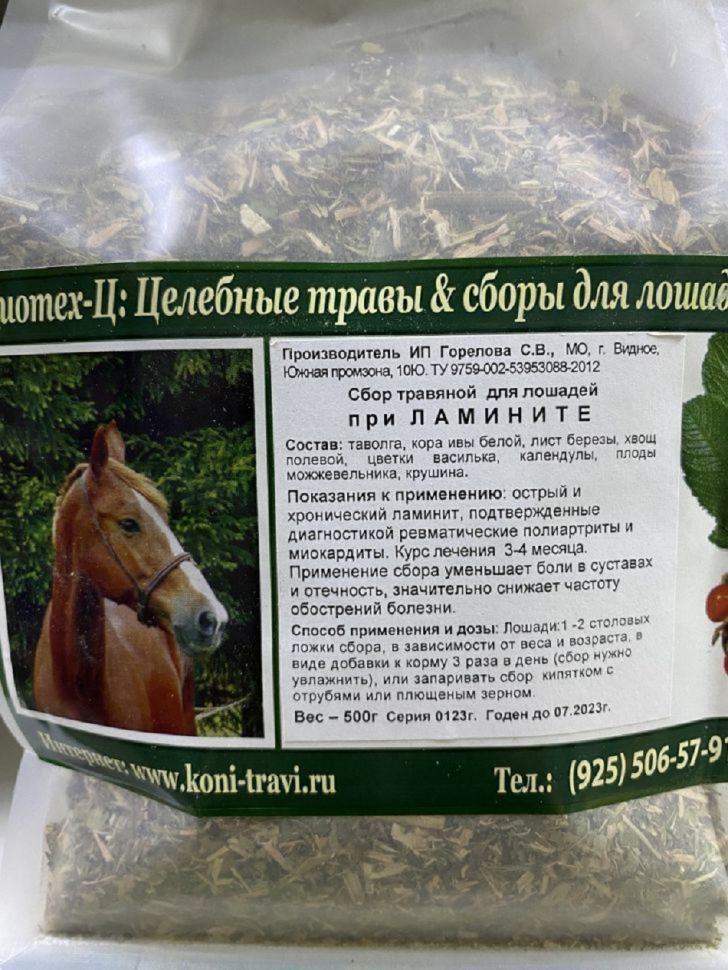 Рекомендации, дозировка | Лошади: 1- 2 столовых ложки сбора, в зависимости от веса и возраста, добавляют к корму 2 раза в день, можно запаривать сбор кипятком с отрубями или плющеным зерном, можно выпоить отвар (2-4 столовых ложки сбора заварить 500 мл воды) в два приема. |