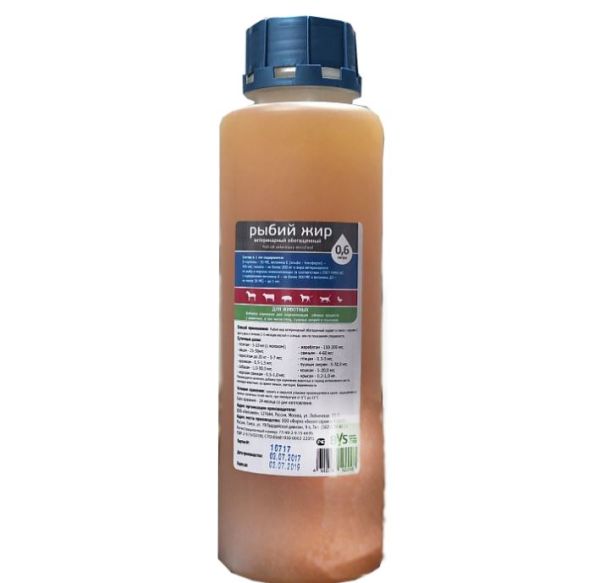 Рыбий жир – это смесь глицеридов, в составе которых есть как Омега-3, так и другие жирные кислоты и минералы. Омега-3 – собирательное название для незаменимых (то есть не синтезируемых организмом самостоятельно) жирных кислот. Омега-3 жирные кислоты укрепляют структуру клеточных мембран и обеспечивает нормальное функционирование всех органов и систем организма. Рекомендуется в качестве витаминной подкормки для собак и кошек, как источник витамина D и незаменимых омега-3 полиненасыщенных жирных кислот, регулирующих жировой обмен, понижающих уровень холестерина в крови, способствующих профилактике сердечно-сосудистых заболеваний и артрита, уменьшению риска тромбообразования, повышению мышечного тонуса и физической выносливости. Подкормка обеспечивает нормальный рост и развитие животного, оказывает оздоровительный эффект на состояние кожи и шерстяного покрова, укрепляет костный скелет, ускоряет процессы восстановления после перенесенных заболеваний, укусов, переломов, улучшает аппетит, благоприятно сказывается при вынашивании потомства.