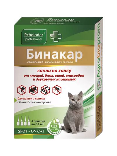 Агробиопром: Бинакар, капли на холку, для кошек, 4 пипетки по 0,4 мл