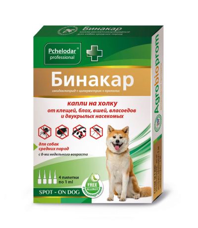 Агробиопром: Бинакар, капли на холку для средних собак, 4 пипетки по 1 мл