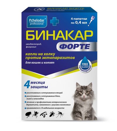 Агробиопром: Бинакар форте, капли на холку, для кошек, 4 пипетки по 0,4 мл
