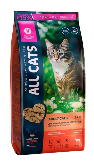 ALL Cats: полноценный корм, для кошек, говядина и овощи, 15 кг