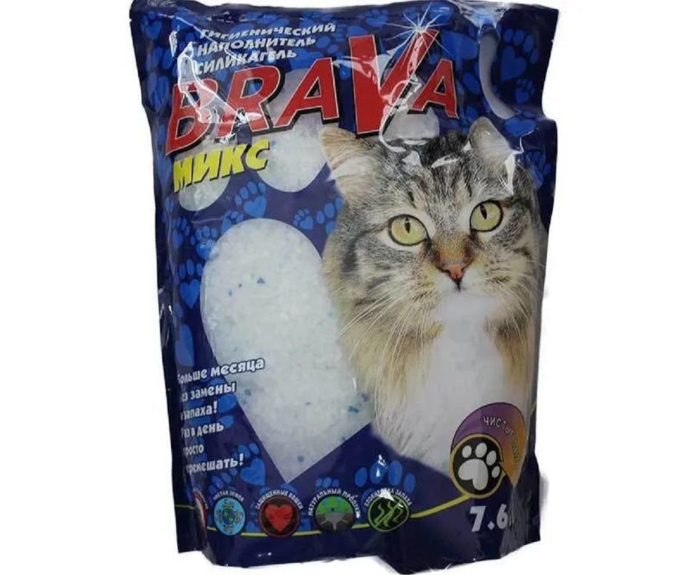 Силикагелевый наполнитель «Brava Микс» – на сегодняшний день одно из лучших предложений по соотношению «цена — качество». Под другим названием именно эта фракция поставляется, в частности, на рынок Японии. Благодаря устойчивой микропористой структуре, мгновенно поглощают запах и влагу. Как пример, упаковка 3,8 л уверенно работает в течении месяца, главный принцип – раз в день просто перемешать. Заменяется полностью лишь при появлении устойчивого запаха. Присутствуют на рынке России с 2009 года. При этом низкая цена, высокое качество и известность марки способствуют стабильно растущему спросу.