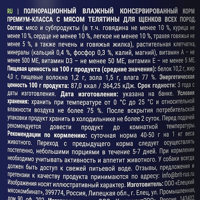 Полнорационный консервированный корм премиум класса телятина для щенков.