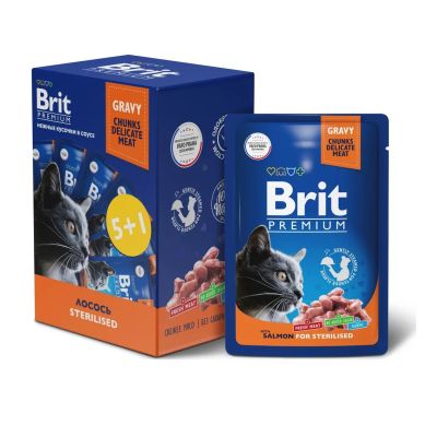 BRIT PREMIUM, Набор паучей для стерилизованных кошек, Лосось в соусе, 5+1, ко...