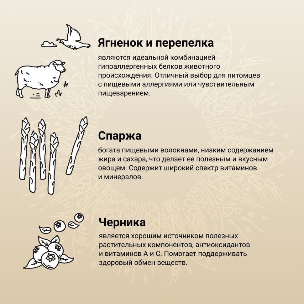 Основные источники белка в корме — свежее мясо ягненка и перепелки. Это редко встречающиеся источники белка, поэтому они подходят животным, склонным к возникновению аллергических реакций. Ягненок и перепелка — отличные источники незаменимых аминокислот, витаминов и минералов. Они легко усваиваются, помогают поддерживать оптимальный вес питомца, стабилизируют обмен веществ.