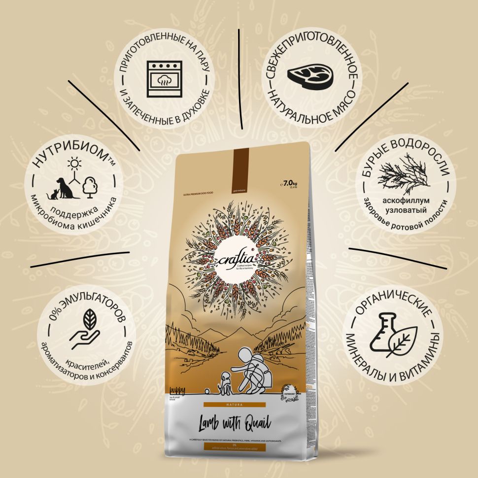 CRAFTIA NATURA сухой корм для щенков миниатюрных и мелких пород из ягненка с перепелкой.