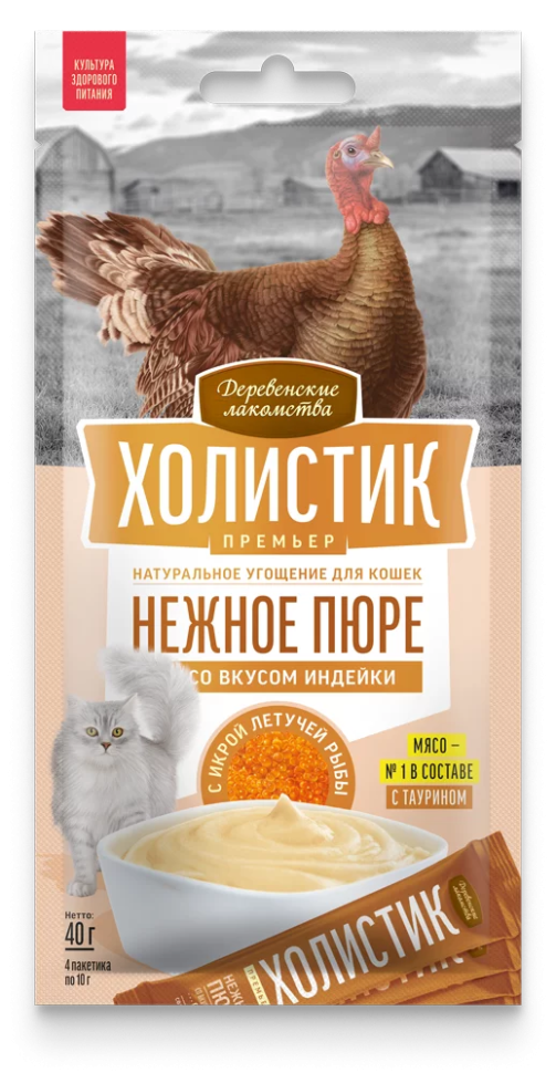 Нежнейшее пюре из отборного мяса индейки с добавлением настоящего деликатеса - икры летучей рыбы, порадует вашу кошку ярким, незабываемым вкусом.