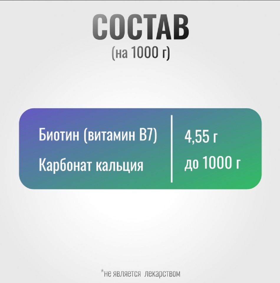 Состав | Биотин - 4,55 г Карбонат кальция - до 1000 г |