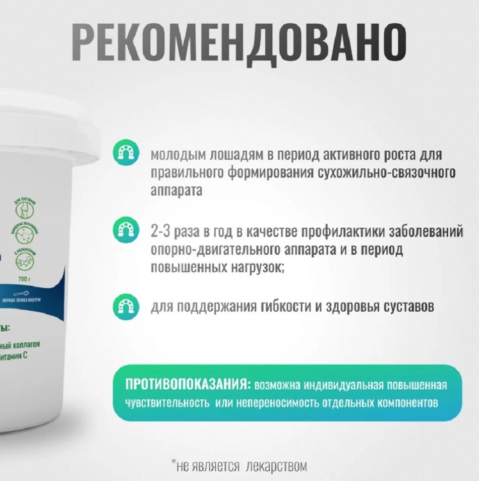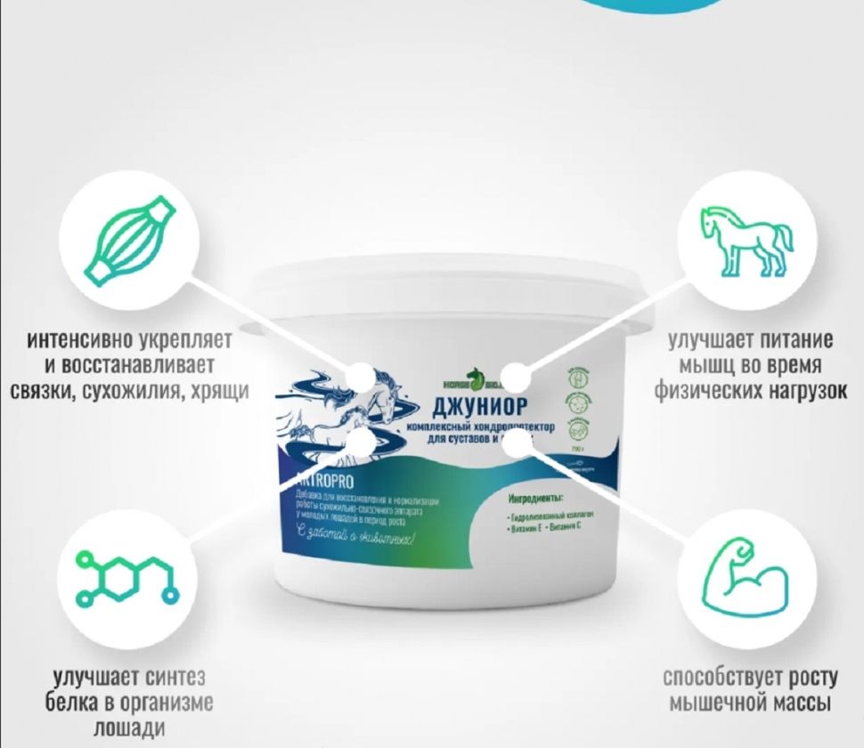 Улучшает питание мышц и поддерживает организм молодой лошади во время физических нагрузок и в период интенсивного роста. Коллагеновые пептиды способствуют обновлению связующих тканей, включая хрящевую. Они являются основным строительным материалом костной и хрящевой тканей и укрепляют сухожильно-связочный аппарат. Добавка улучшает синтез белка в организме лошади, увеличивая его количество - это способствует росту мышечной массы.