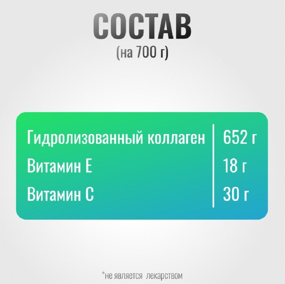 Состав | Гидролизованный коллаген - 652 г; Витамин Е - 18 г; Витамин С - 30 г |