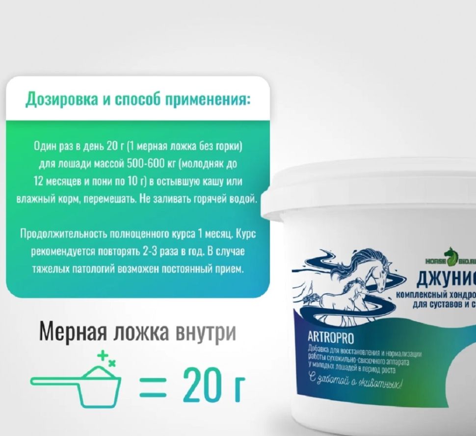 Дозировка и способ применения: один раз в день 20 г (1 мерная ложка без горки) для лошади массой 500-600 кг (молодняк до12 месяцев и пони по 10 г) в остывшую кашу или влажный корм, перемешать. Не заливать горячей водой.