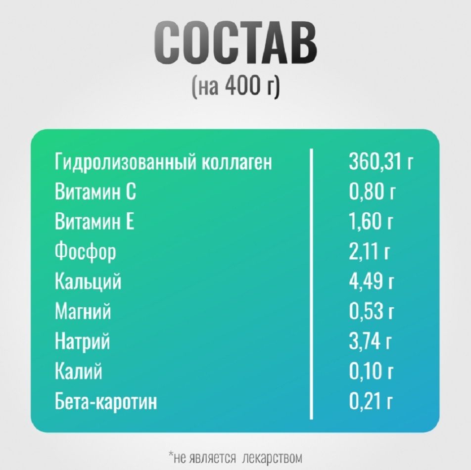 Состав | Гидролизованный коллаген - 360,31 г; Витамин C - 0,8 г; Витамин E - 1,6 г; |