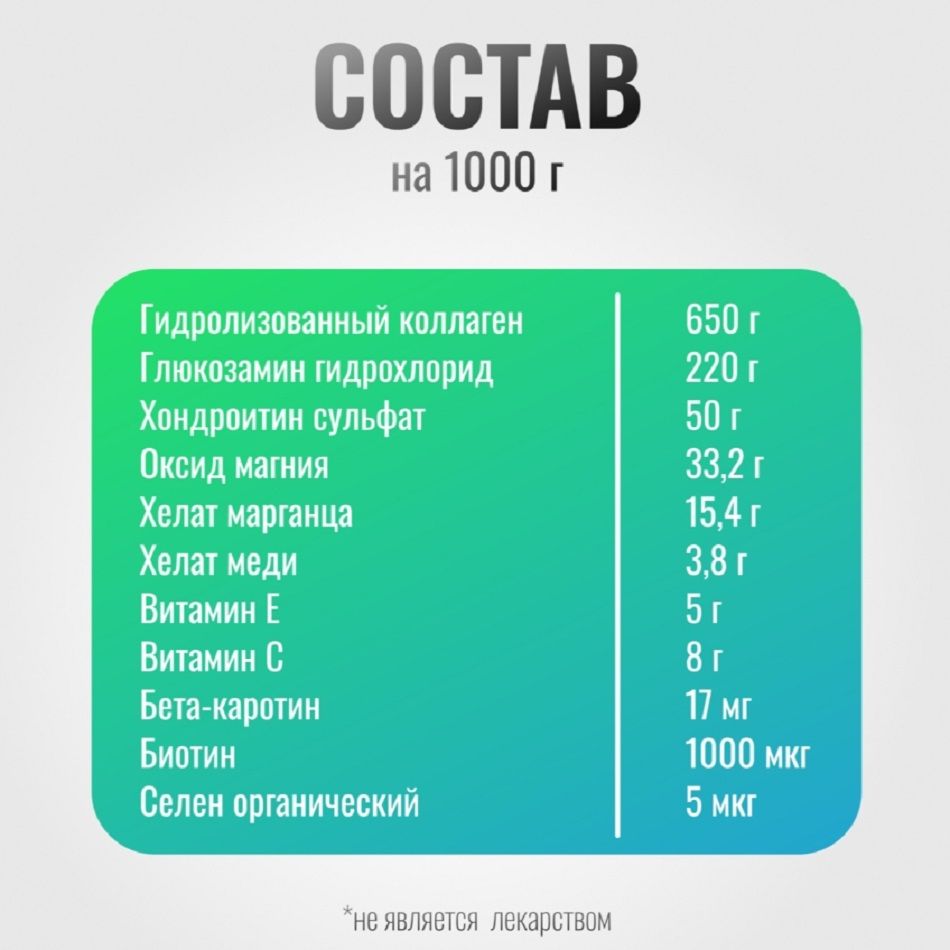 Состав | Гидролизованный коллаген - 650 г Глюкозамин гидрохлорид - 220 г Хондроитин сульфат - 50 г |