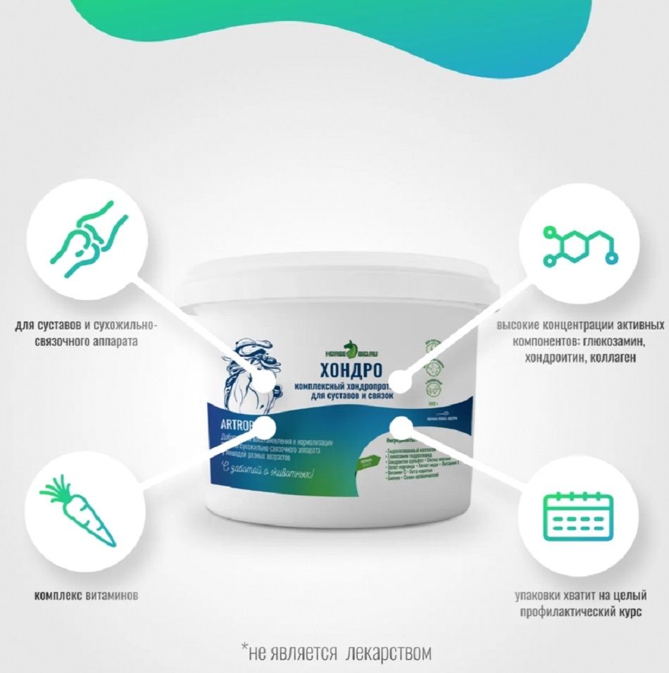 Действие: снимает воспаление и интенсивно восстанавливает связки и хрящи при хронических заболеваниях или травмах опорно-двигательного аппарата, поддерживает организм лошади во время интенсивных физических нагрузок.