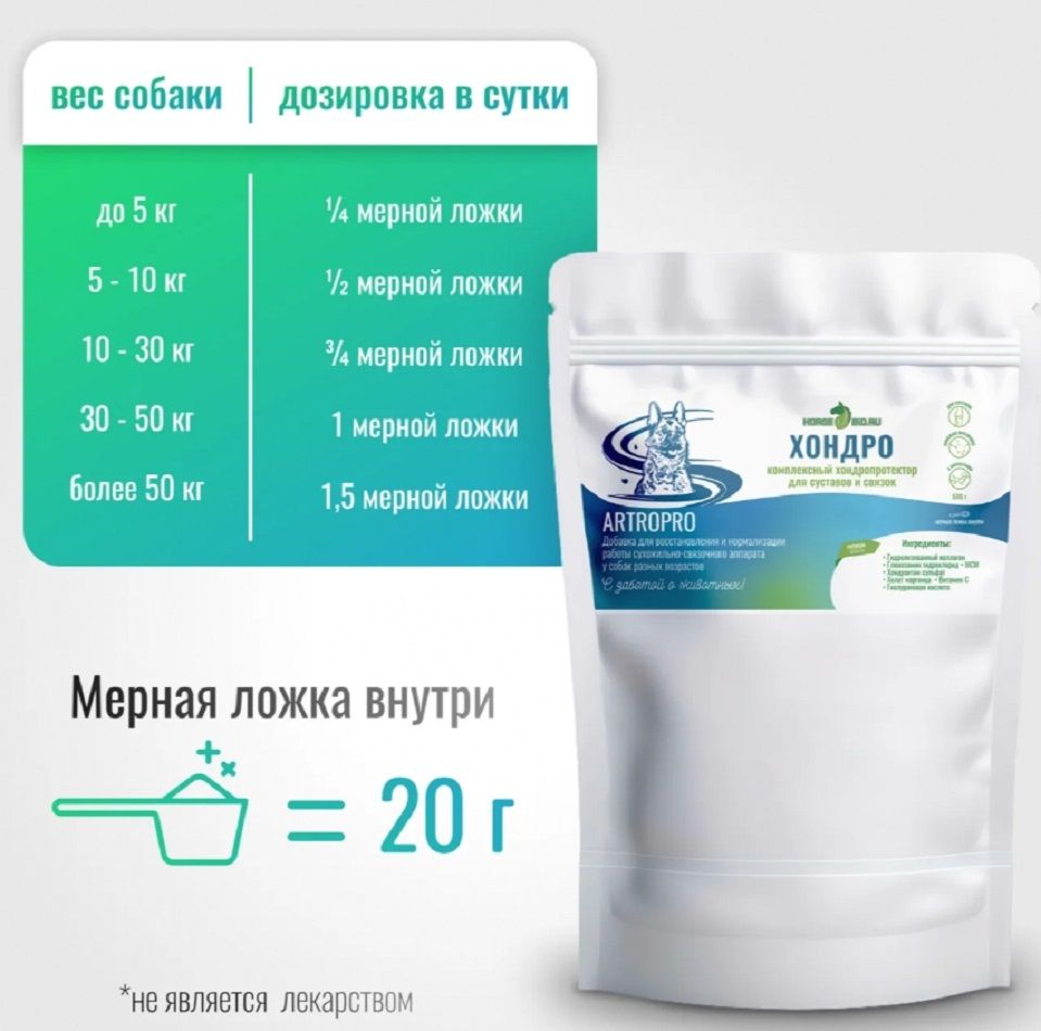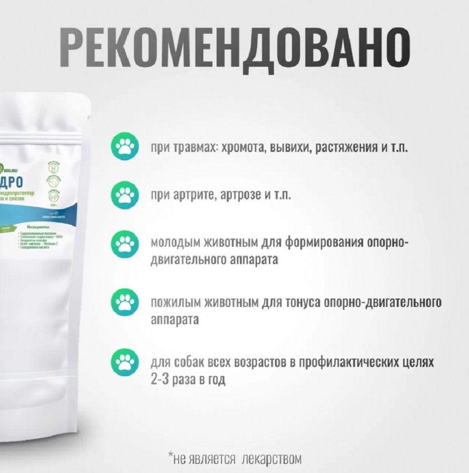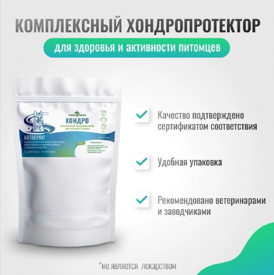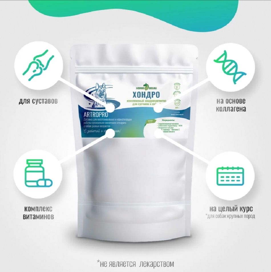 Действие: снимает воспаление, восстанавливает связки и хрящи при хронических заболеваниях или травмах опорно-двигательного аппарата, поддерживает организм собаки во время интенсивных физических нагрузок.