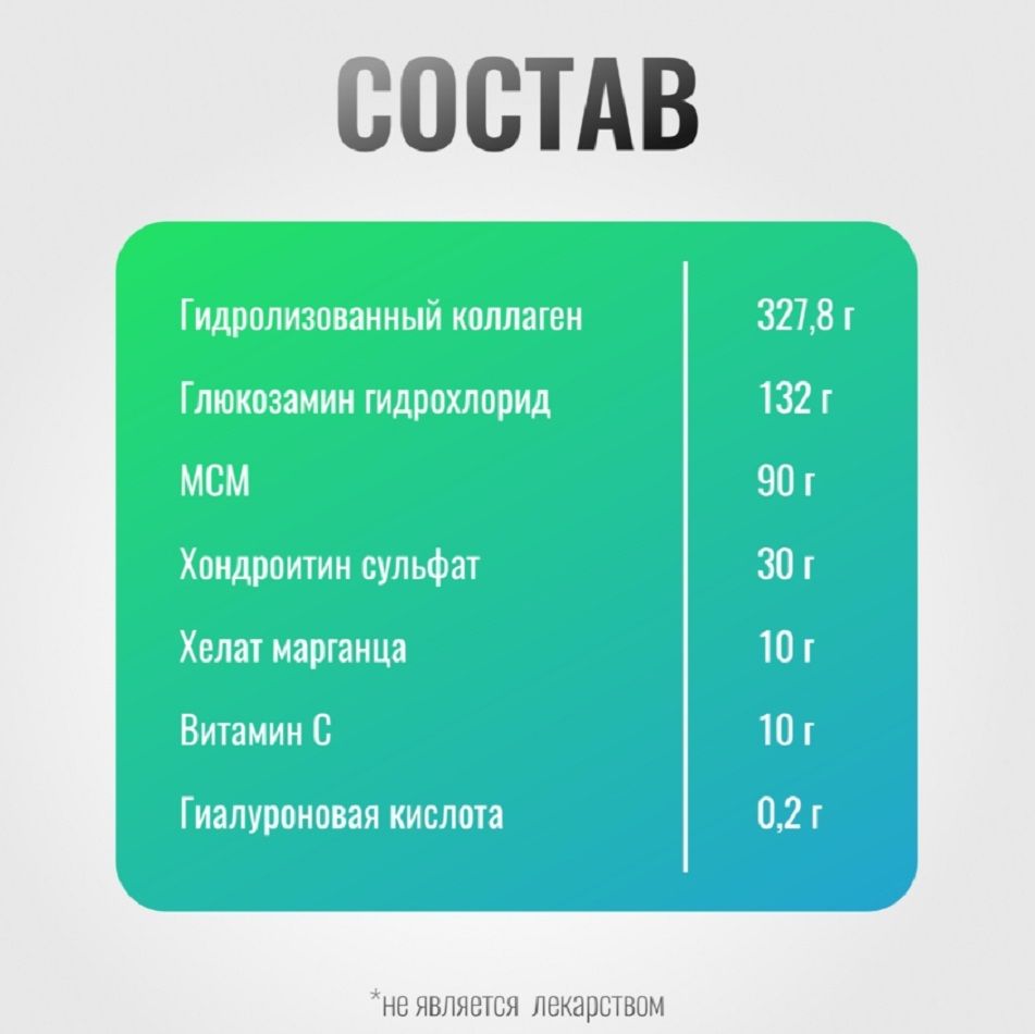 Состав | Гидролизованный коллаген - 327,8 г; глюкозамин гидрохлорид - 132 г; МСМ - 90 г; хондроитин сульфат - 30 г; хелат марганца - 10 г; витамин С - 10 г; гиалуроновая кислота - 0,2 г. |