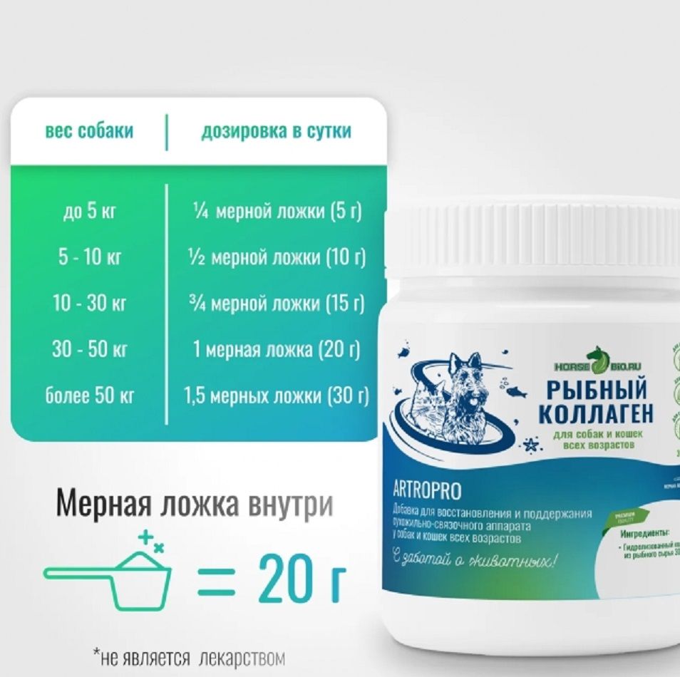 Рекомендации, дозировка | До 5 кг - 1/4 мерной ложки или 1 чайная ложка (5 г) От 5 до 10 кг - 1/2 мерной ложки или 2 чайные ложки (10 г) |