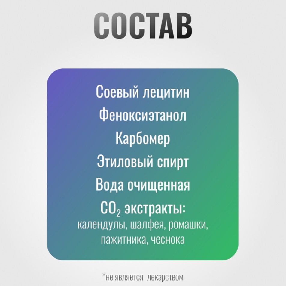 Состав | соевый лецитин феноксиэтанол карбомер этиловый спирт СО2 экстракты: календулы, шалфея, ромашки, пажитника, чеснока, вода очищенная. |