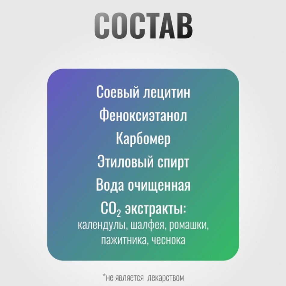 Состав | соевый лецитин феноксиэтанол карбомер этиловый спирт СО2 экстракты: календулы, шалфея, ромашки, пажитника, чеснока, вода очищенная. |