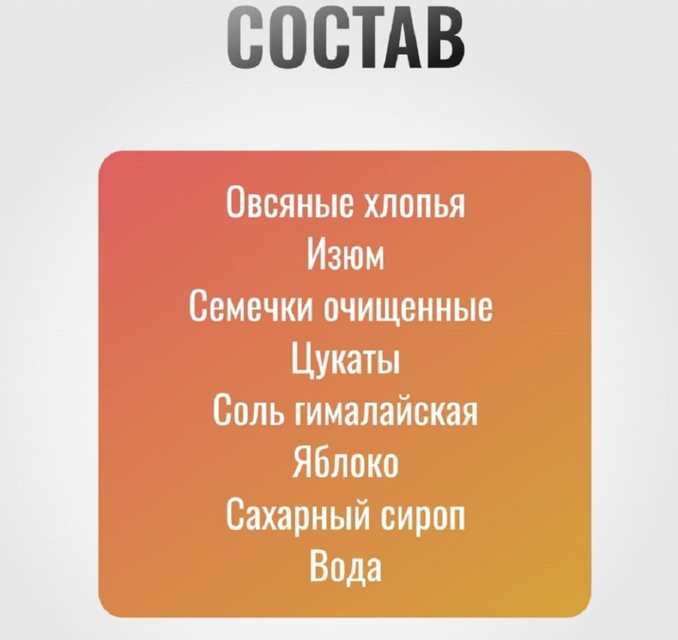 Состав: овсяные хлопья, изюм, семечки очищенные, цукаты, гималайская соль, яблоко, сахарный сироп, вода.