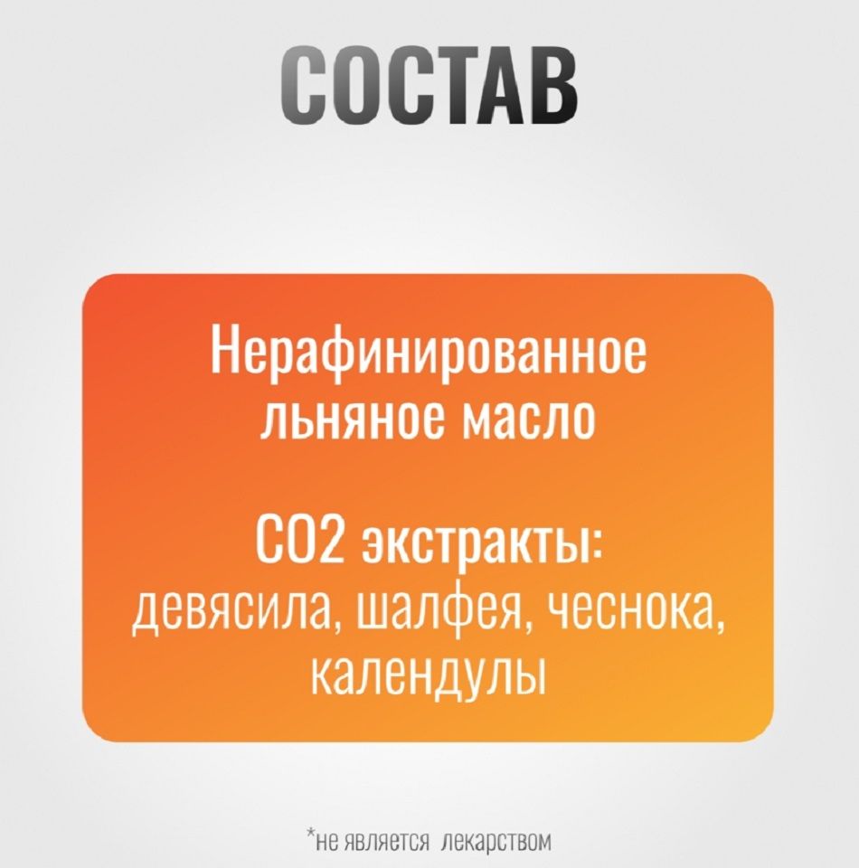 Состав | Нерафинированное льняное масло • СО2 экстракты: девясила, шалфея, чеснока, календулы. |