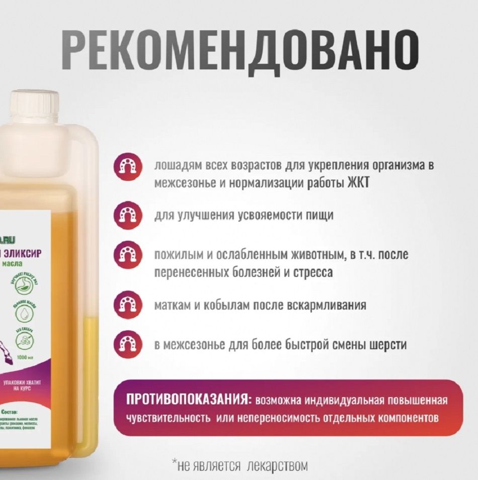 Рекомендации, дозировка | Лошадь весом 500 - 600 кг - 30 мл; Тяжеловозы весом более 600 кг - 40 мл |
