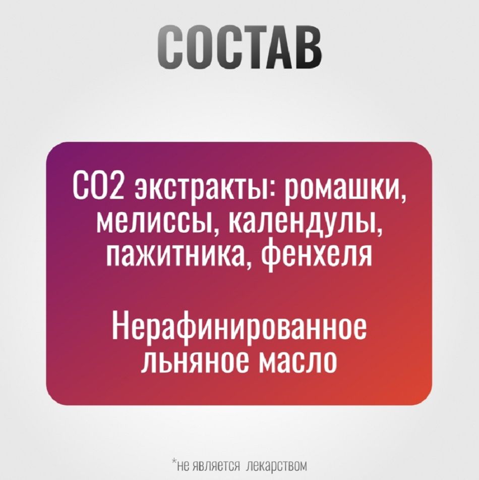 Состав | Нерафинированное льняное масло СО2 экстракты: ромашки, мелиссы, календулы, пажитника, фенхеля |