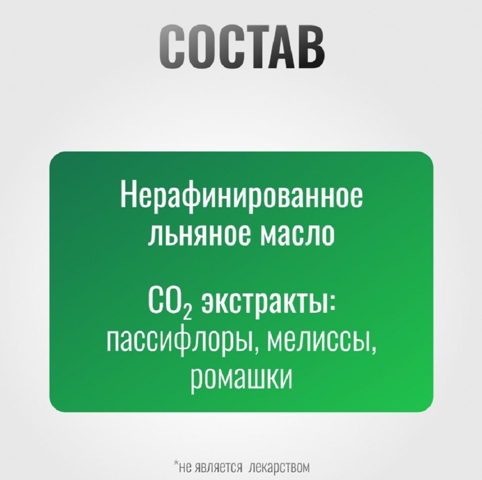 Состав | Нерафинированное льняное масло СО2 экстракты: пассифлоры, мелиссы, ромашки |