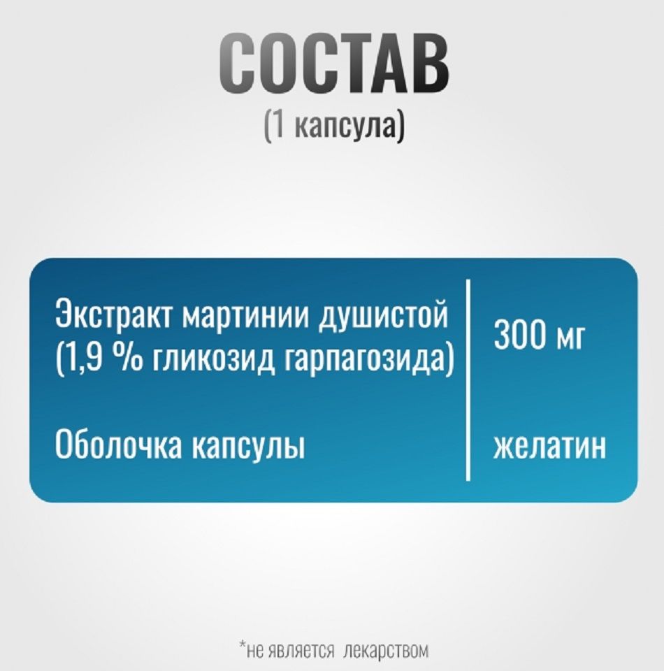 Состав | Экстракт мартинии душистой (1,9 % гликозид гарпагозида) - 300 мг Оболочка капсулы - желатин |