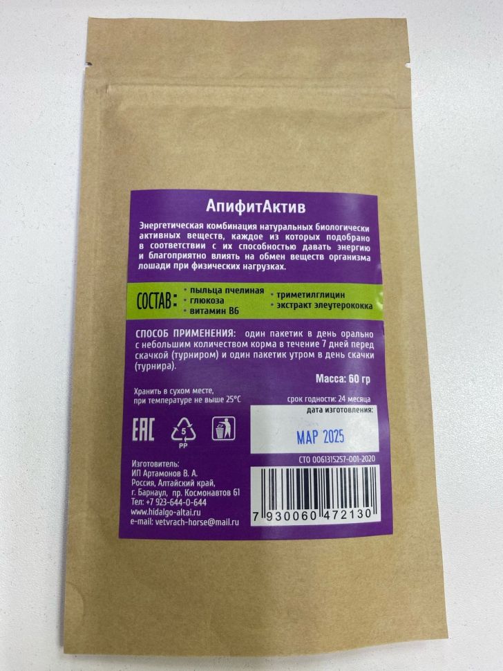 Апифит Актив - это энергетическая комбинация натуральных биологически активных веществ, каждое из которых подобрано в соответствии с их способностью давать энергию и благоприятно влиять на обмен веществ организма лошади при физических нагрузках.
