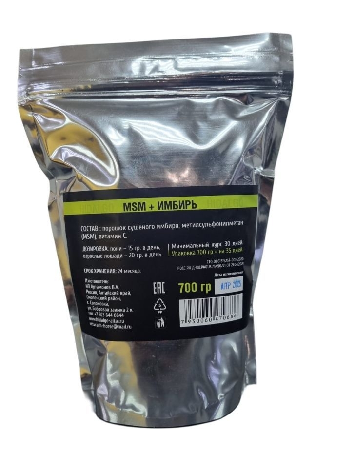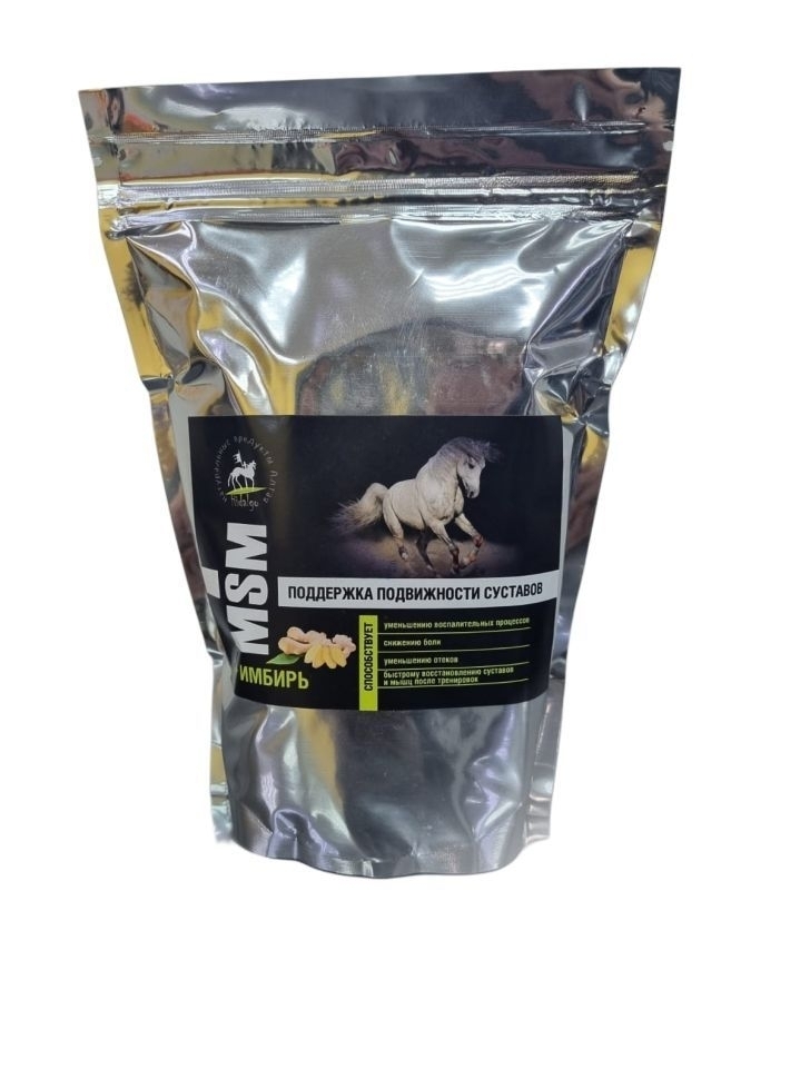 Натуральная кормовая добавка для лошадей, содержащая метилсульфонилметан (MSM) – серу органического происхождения и порошок корня имбиря, витамин С.