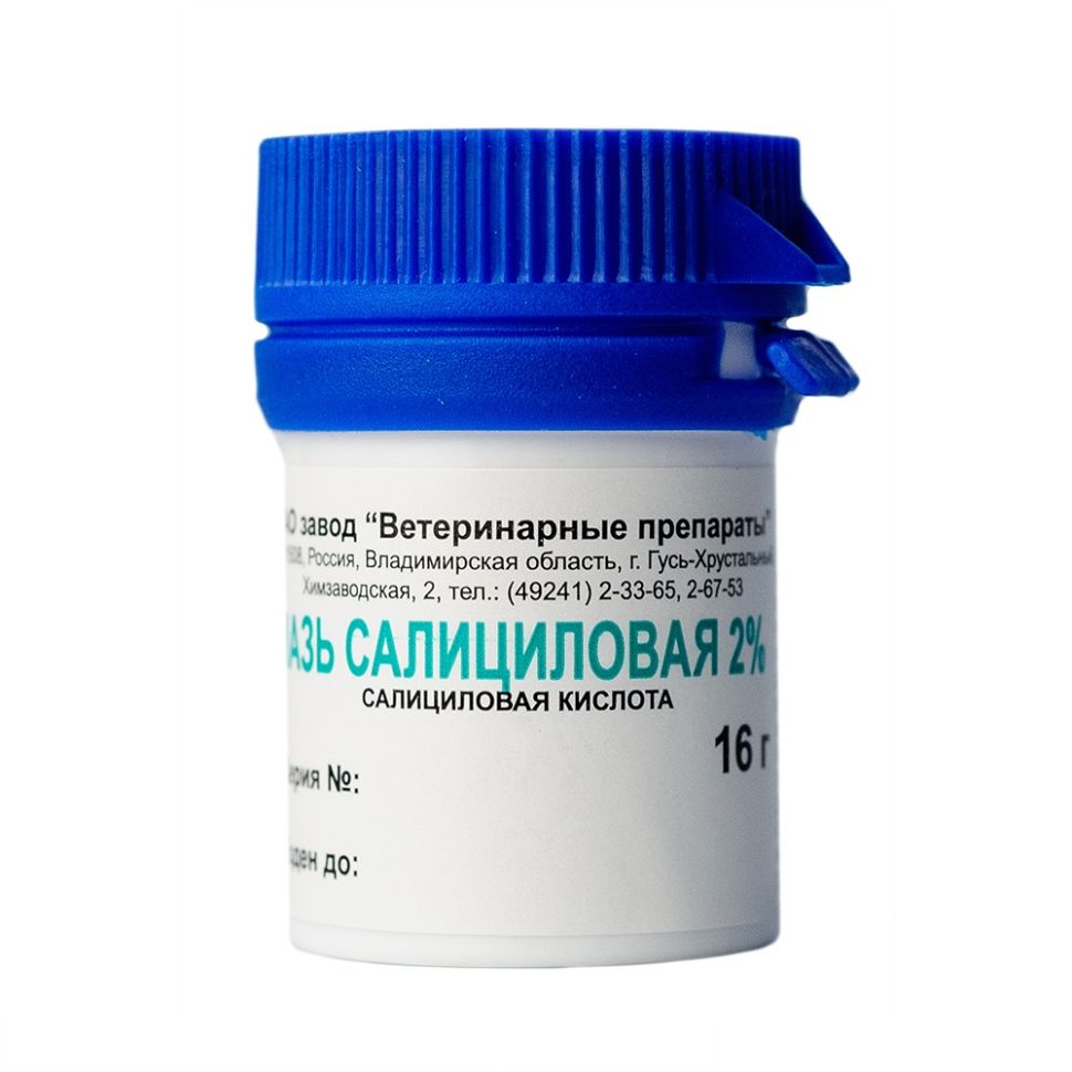 Мазь салициловую 2% назначают животным в качестве антисептического средства при воспалительных заболеваниях кожи.