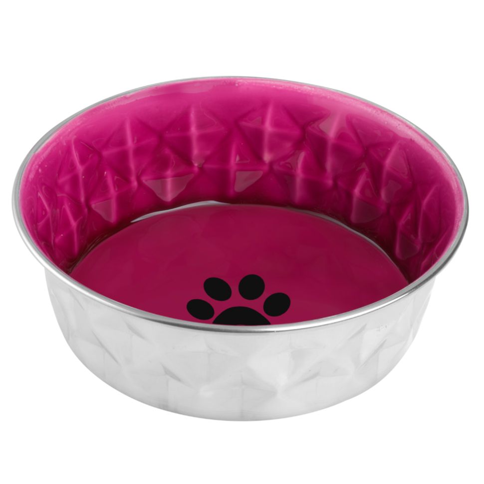 Яркая и стильная миска для кормления питомцев из нержавеющей стали. Дизайн миски имитирует огранку драгоценных камней, подчёркивая важность приема пищи для вашего питомца. Удобная эргономичная форма миски наилучшим образом подходит для всех видов корма и воды. Миска устойчива и не переворачивается за счет силиконовой накладки на дне. Прочный и безопасный материал – нержавеющая сталь – надолго сохранят свежесть воды и корма. Яркое керамическое покрытие дополнительно защищает и предотвращает поверхность миски от появления царапин. Объем – 2,7 л Преимущества аксессуаров из нержавеющей стали: • Долговечность. Нержавеющая сталь – очень прочный и износостойкий материал. • Безопасность. Нержавеющая сталь совершенно безопасна для животного. Даже при длительной эксплуатации материал не выделяет в воду и пищу вредоносных веществ. • Гигиеничность. Нержавеющая сталь не царапается и не трескается, а значит, в местах повреждений не будут скапливаться бактерии. • Отсутствие запаха. Нержавеющая сталь не имеет запаха и не влияет на вкус воды или пищи.