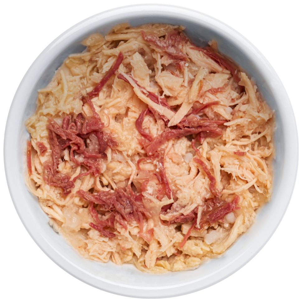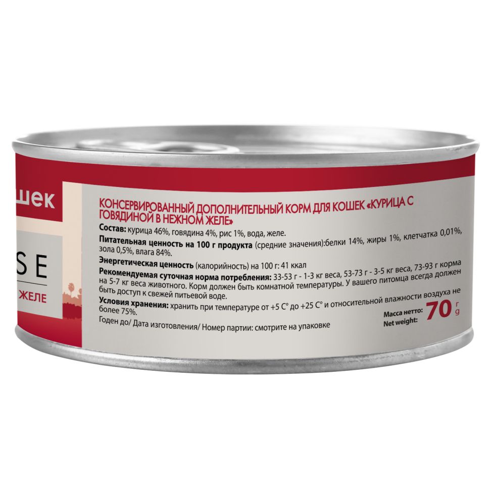 Состав: курица (46 %), говядина (4 %), рис (1 %), вода, желе.