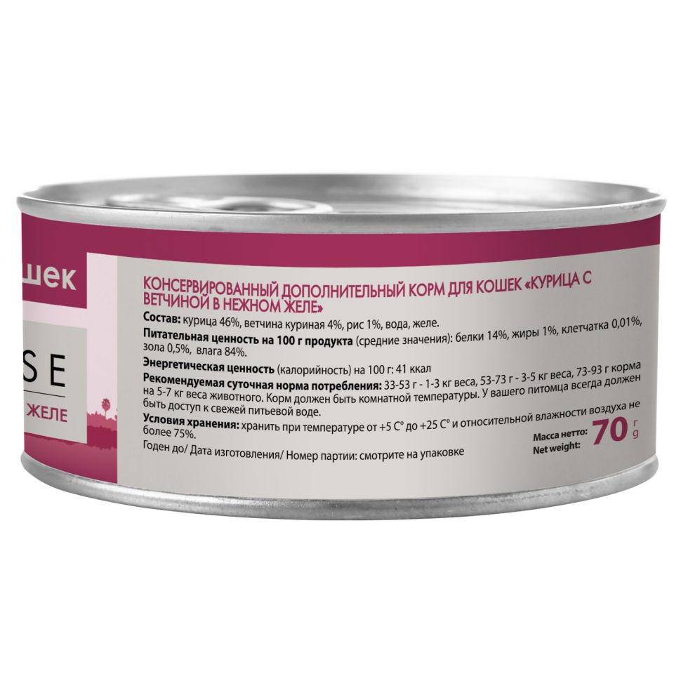 Состав: курица (46 %), ветчина куриная (4 %), рис (1 %), вода, желе.