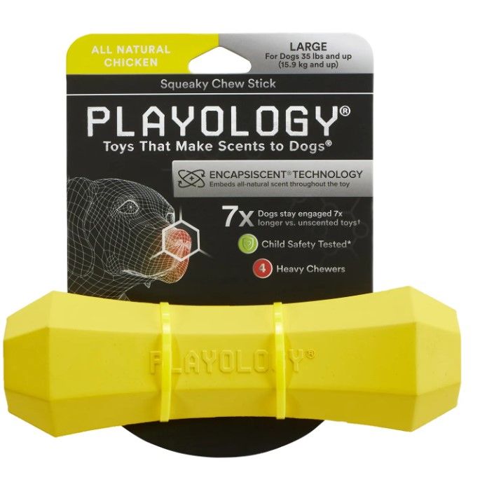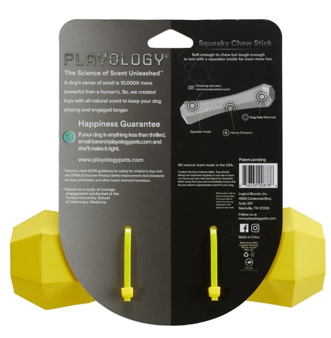 Playology ® разрабатывает ароматизированные игрушки, изготовленные из безопасных для собак материалов, которые занимают собаку в 7 раз дольше, чем игрушка без запаха. В основу каждой игрушки заложена технология «вживленного аромата» (ENCAPSISCENT®), ароматизированные частицы по запатентованной формуле буквально внедрены на микроскопическом уровне в прочный материал игрушек, будь то резина или текстиль, что делает их абсолютно уникальными и долго сохраняющими аромат. Двухслойная палочка SQUEAKY CHEW STICK обладает соблазнительным для собаки запахом и двухслойным ребристым дизайном, который обеспечивает питомцу безопасное и приятное жевание, имитирующее жевание в дикой природе. Она подходит для умеренно грызущих взрослых собак всех возрастов (от 15.9 кг и более). Обратите внимание: нет неразрушимых игрушек, любую игрушку следует регулярно осматривать и забирать, если игрушка повреждена, чтобы исключить травмирование питомца. Убедитесь, что выбранная вами игрушка подходит по размеру и темпераменту вашей собаки. Не подлежит обязательной сертификации.