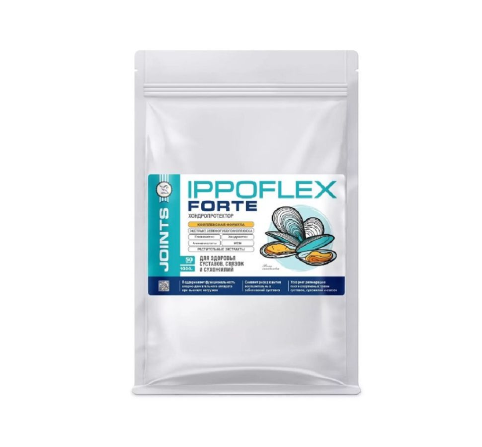 Иппофлекс Форте содержит в 20 г: глюкозамина сульфата – 5.000 мг, метилсульфонилметана – 4.000 мг, экстракт из новозеландского зеленогубого моллюска (Perna Canaliculus) – 3.000 мг, растительные экстракты (имбирь, таволга, ивовая кора) – 2.600 мг, экстракт шиповника-2.500 мг, хондроитина сульфата – 1.400 мг, аминокислоты (цистин, аргинин, тирозин, гистидин, лейцин, фенилаланин, изолейцин, триптофан, лизин, метионин, валин, пролин, аланин, глицин, серин, треонин, аспарагиновая к-та) – 1 250 мг, аморфный диоксид кремния – 1.230 мг, лизаты лактобактерий – 1.000 мг, экстракт юкки-500 мг, витамин С -120 мг.