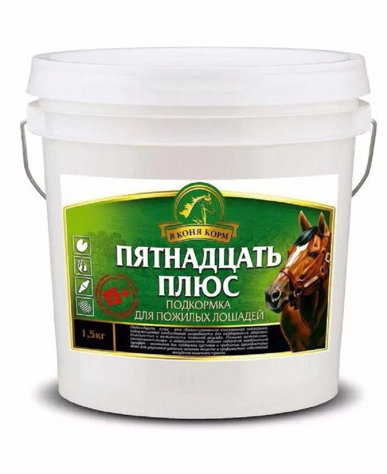 Пятнадцать плюс - это сбалансированная комплексная подкормка, содержащая все необходимые ингредиенты для поддержания здоровья, долголетия и активности пожилой лошади. Помимо витаминов, аминокислот, микро- и макроэлементов, добавка содержит хондроитина сульфат - компонент для поддержки суставов и пробиотик Целлобактерин плюс для улучшения усвоения полезных веществ и профилактики заболеваний желудочно-кишечного тракта.