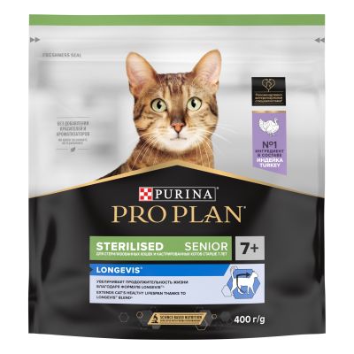 Команда квалифицированных ветеринарных специалистов и диетологов разработала корм для стерилизованных кошек сухой с индейкой серии PRO PLAN Sterilised LONGEVIS для стерилизованных кошек старше 7 лет. Этот сбалансированный корм для кошек легко усваивается и обеспечивает организм пожилых питомцев всеми питательными веществами, необходимыми для поддержания их здоровья и активности в любом возрасте.