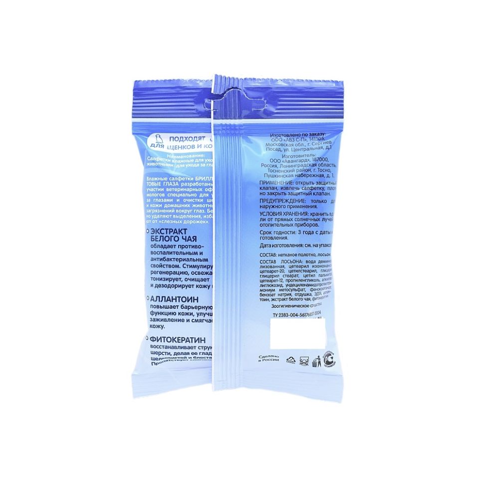 Салфетки разработаны при участии ветеринарных офтальмологов специально для ухода за глазами и очистки шерсти и кожи вокруг глаз животного. Они бережно удаляют выделения из глаз. Избавляют от «слёзных дорожек». Способствуют устранению запаха от выделений из глаз. Подходят для применения котятам и щенкам.